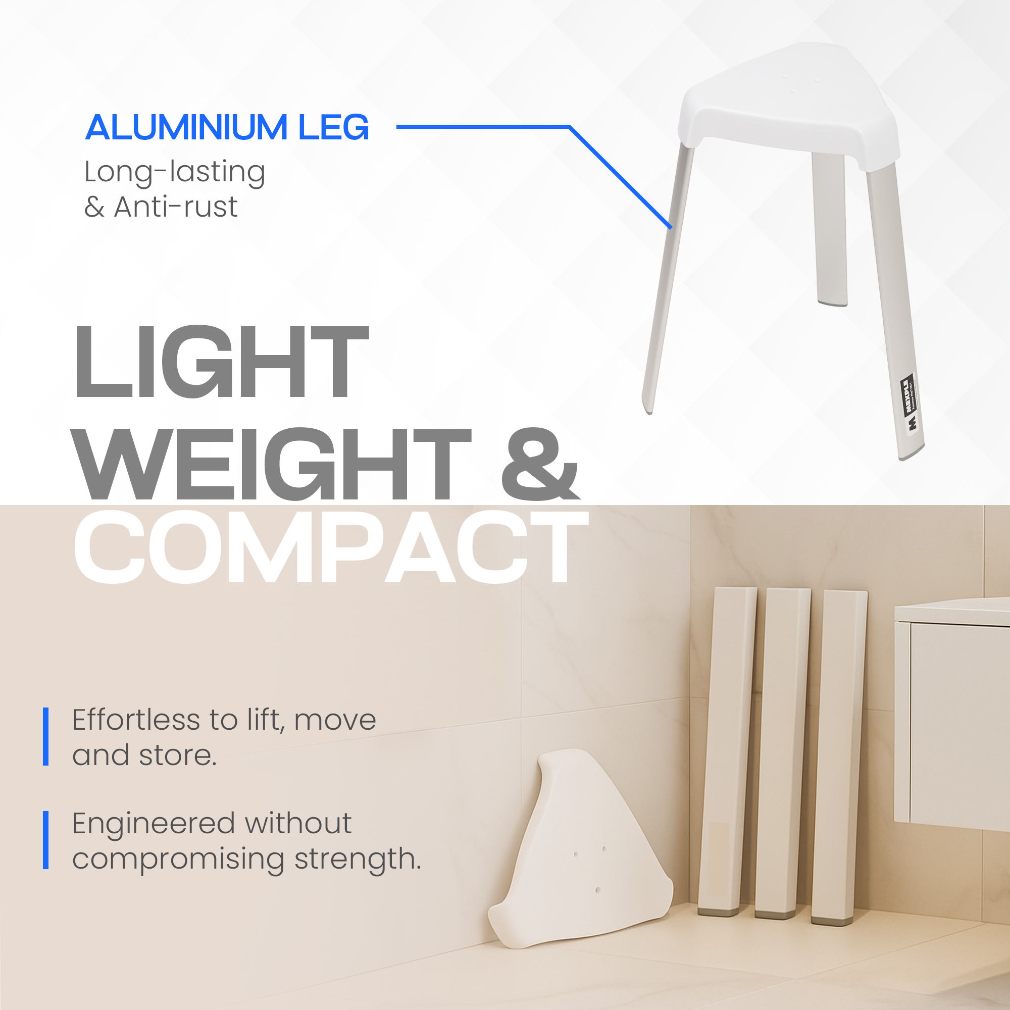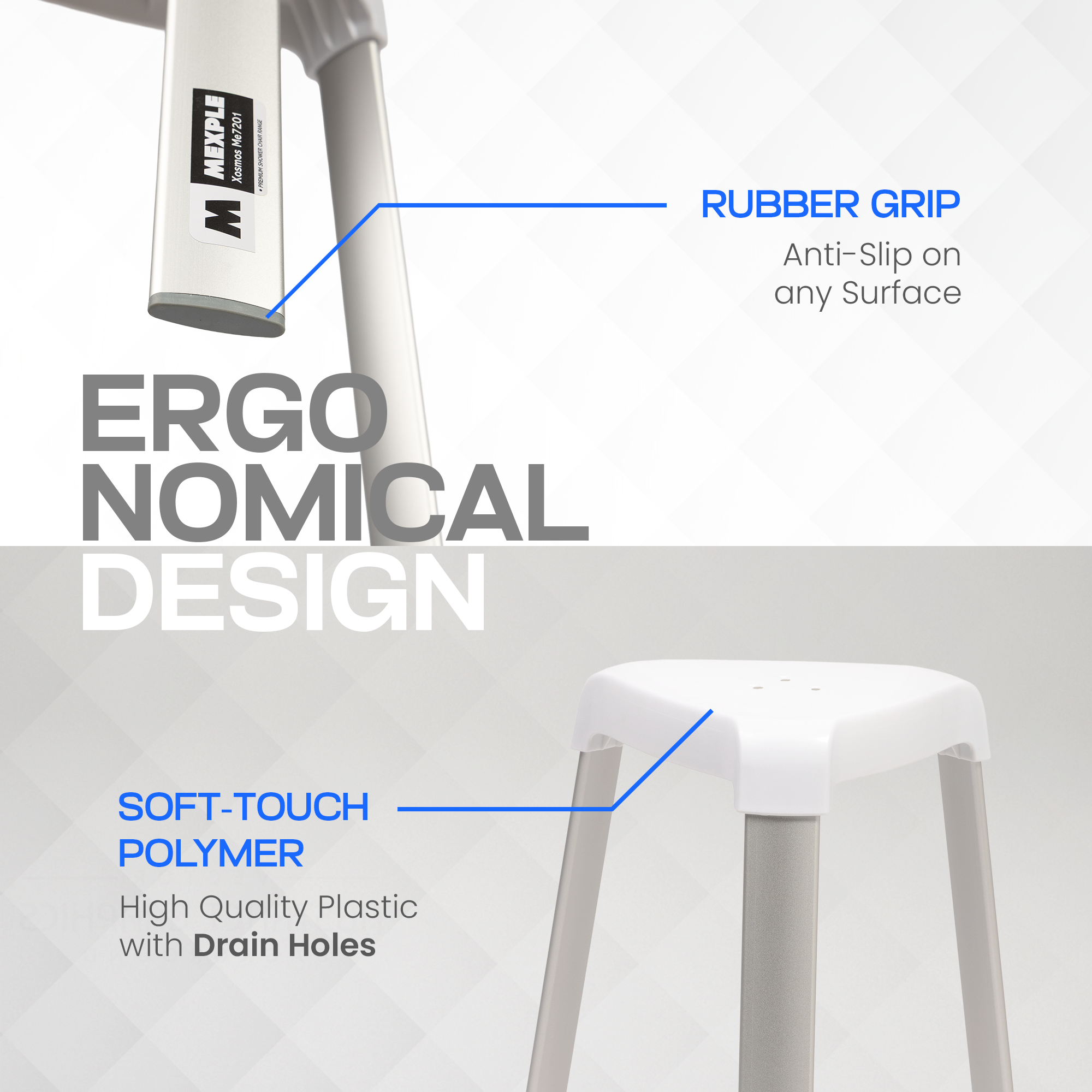 - 🦶 ANTI-SLIP RUBBER GRIP : Non-slip rubber shoes on each leg prevent sliding on wet tiles, ensuring optimal safety for seniors, disabled individuals and caregivers.